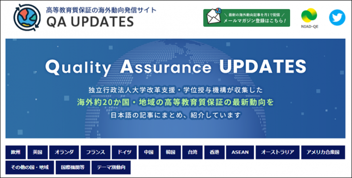 当機構の国際課が運営する高等教育質保証の海外動向発信サイト「QA UPDATES」では、海外の主要国・地域における高等教育質保証の制度導入・改正の情報をはじめ、関連政策やプロジェクトの最新動向について、当該国の公的機関や国際的な団体が発信する情報をもとに、記事化して紹介するものです。高等教育の国際連携や質保証等の活動に携わっている方々が、海外の動向を収集される際に本サイトをご活用いただき、国際動向を踏まえた高等教育の諸活動の一助となれば幸いです。