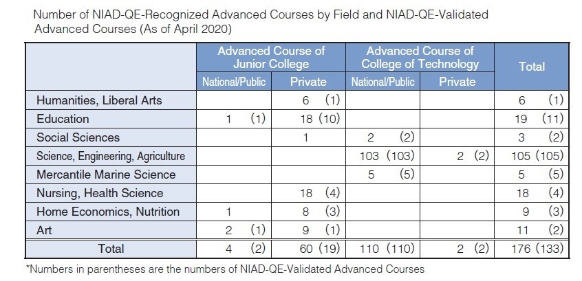 Number of NIAD-QE-Recognized Advanced Courses by Field and NIAD-QE-Validated Advanced Courses (As of April 2020)