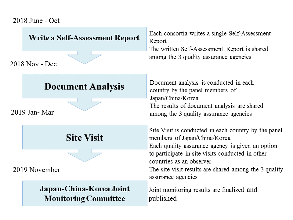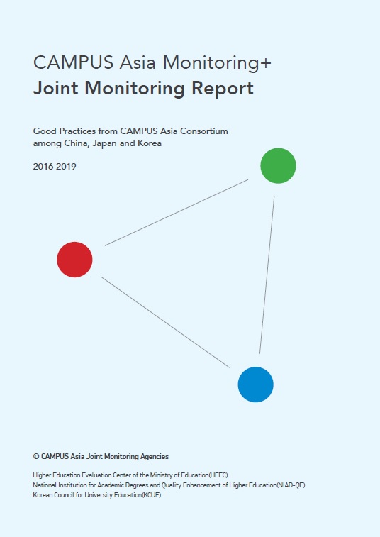 Under the banner of “Monitoring+ (plus)”, the quality assurance agencies of the three countries (NIAD-QE in Japan, HEEC in China, and KCUE in Korea) conducted monitoring on the "CAMPUS Asia" full-fledged (mode 2) programs in 2018-2019. Monitoring+ was conducted in accordance with the framework defined in the "Joint Guidelines for Monitoring International Cooperative Academic Programs in CAMPUS Asia"—guidelines developed based on experience accumulated through previously conducted monitoring efforts.