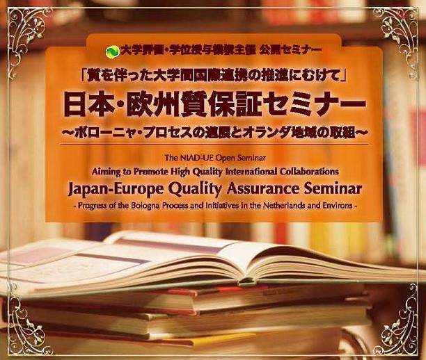 On June 17, 2010, the National Institution for Academic Degrees and University Evaluation (NIAD-UE) organized an open seminar at the Gakushikaikan titled, 'Aiming to Promote High-quality International Collaboration: the Japan-Europe Quality Assurance Seminar - Progress of the Bologna Process and Initiatives in the Netherlands and its Environs'. The seminar had the support of the Japanese Ministry of Education, Culture, Sports, Science and Technology (MEXT) and the Embassy of the Kingdom of the Netherlands.