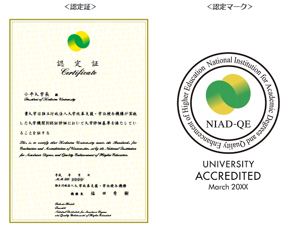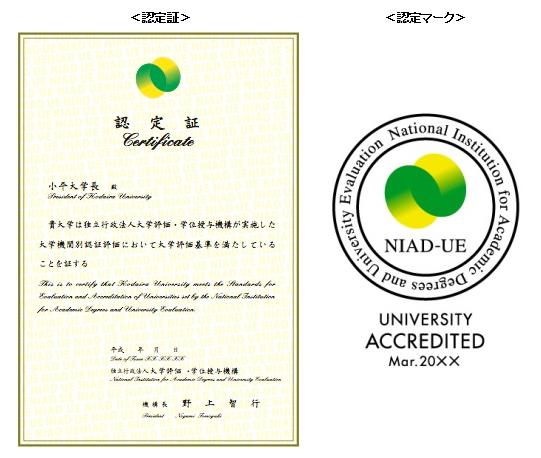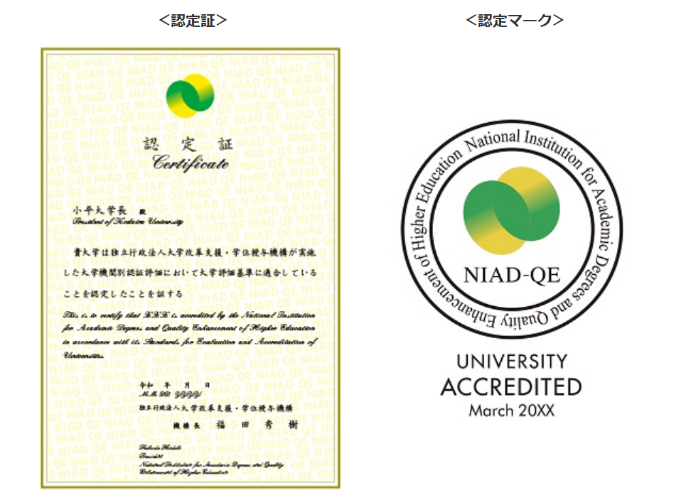 大学改革支援・学位授与機構では、当機構の大学機関別認証評価を受け、大学評価基準に適合していると認められた大学に対し、その証として認定証を交付するとともに、そのことを各大学が分かりやすく社会に示すことができるように認定マークを交付しています。