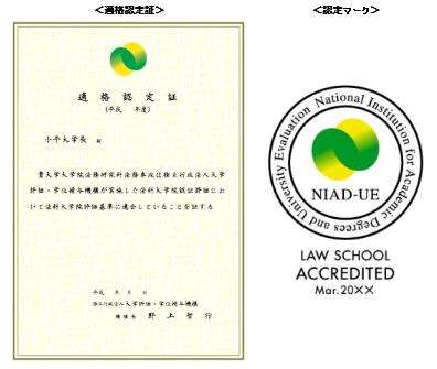 大学改革支援・学位授与機構では、当機構の法科大学院認証評価を受け、大学評価基準に適合していると認められた法科大学院を置く大学に対し、その証として認定証を交付するとともに、そのことを各大学が分かりやすく社会に示すことができるように認定マークを交付しています。