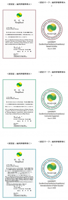 大学改革支援・学位授与機構では、平成26年度実施の大学機関別選択評価から、機構の定めた選択評価事項に係る大学が有する目的の達成状況を証するために認定証を交付するとともに、そのことを各大学が分かりやすく社会に示すことができるように認定マークを交付しています。