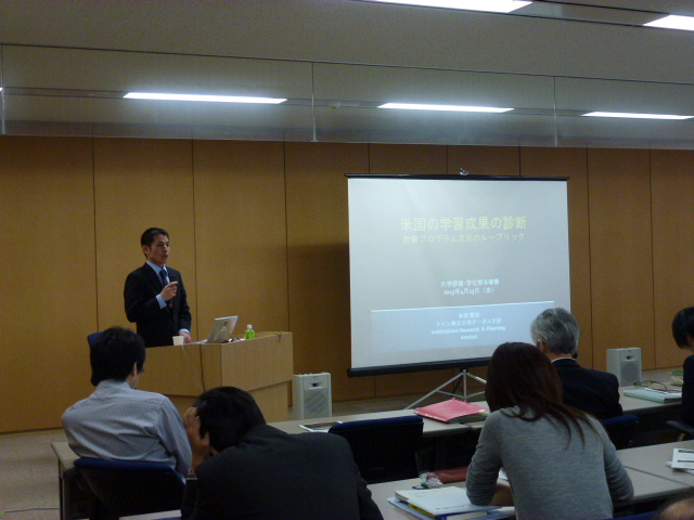 4月12日(金)に小平本部にて、米国メイン州立大学オーガスタ校の本田寛輔様より米国における学習成果の診断に関するご講演を行っていただきました。本田講師(Ph.D)はアメリカの大学において、学習成果アセスメント(診断)とインスティテューショナル・リサーチ(Institutional Research: IR)に携わっておられます。