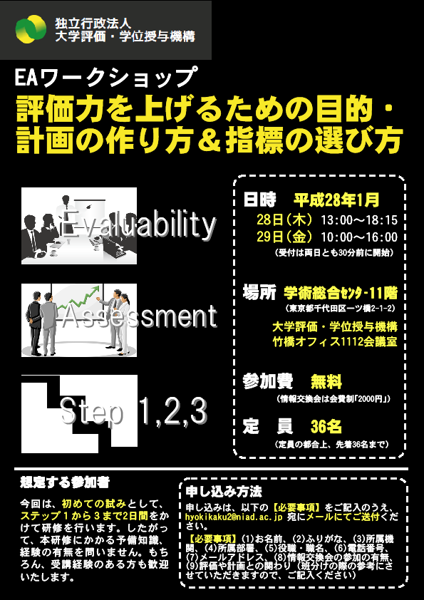 EAワークショップ「評価力を上げるための目的・計画の作り方&指標の選び方」(平成28年1月28日(木)、29日(金)開催)