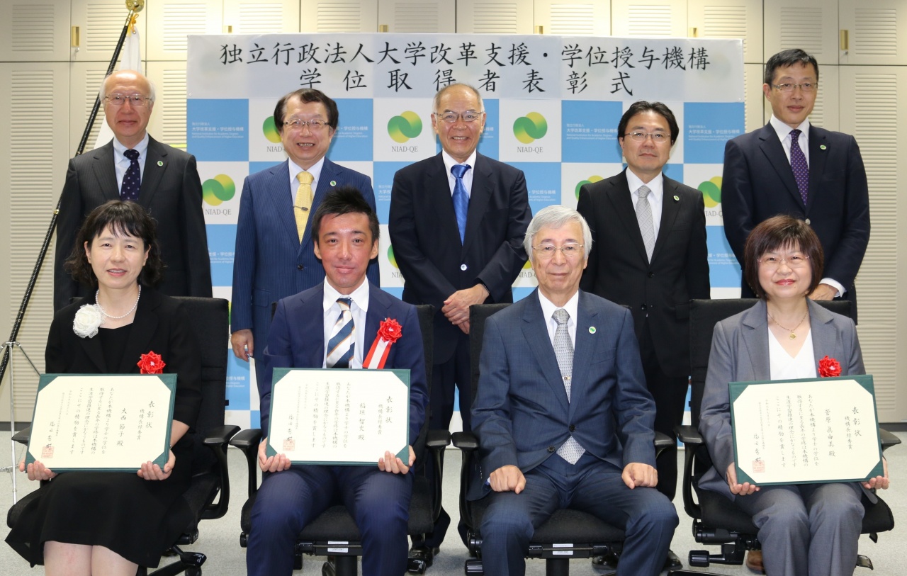 今年度は平成30年度の学士の学位取得者から選考された菅原眞由美氏、稲垣智史氏、大西節子氏の3名に対し、福田機構長から表彰状と記念品が授与されました。