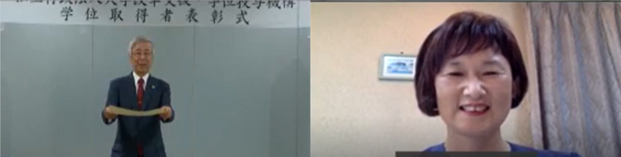 当機構では、学士の学位を取得した者のうち、生涯学習に努め、特に精励したと認められた者を対象とする表彰制度として、平成29年度に「機構長緑秀賞」を創設し、今年度は令和2年度の学士の学位取得者から青山和美氏を表彰しました。