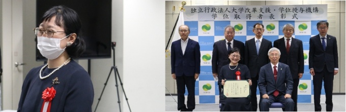 今年度は、令和3年度の学士の学位取得者から原啓子氏を表彰しました。