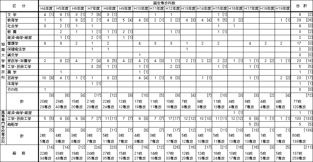 (注2)「合計」欄の学校数については,実数を記載(同一校において他の専攻科を認定したこと及び専攻科が廃止されたこと等により単純に累計とならない)。
