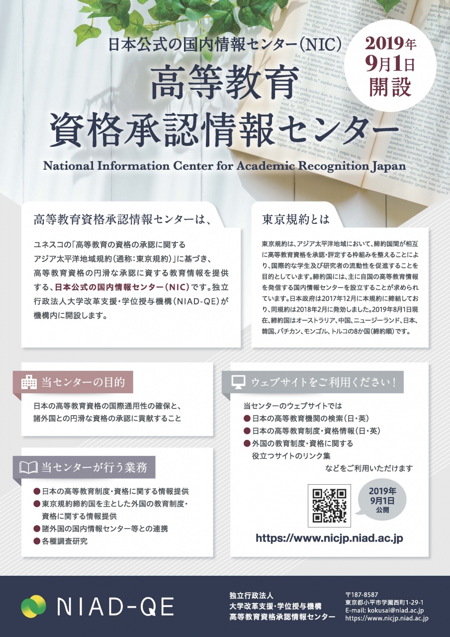◇高等教育資格承認情報センター ウェブサイト:https://www.nicjp.niad.ac.jp