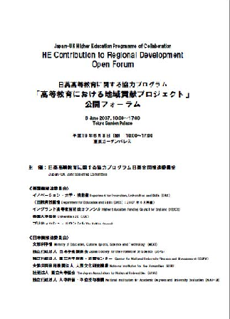| 2007年6月8日 | 日英高等教育に関する協力プログラム 「高等教育における地域貢献プロジェクト」公開フォーラム |
